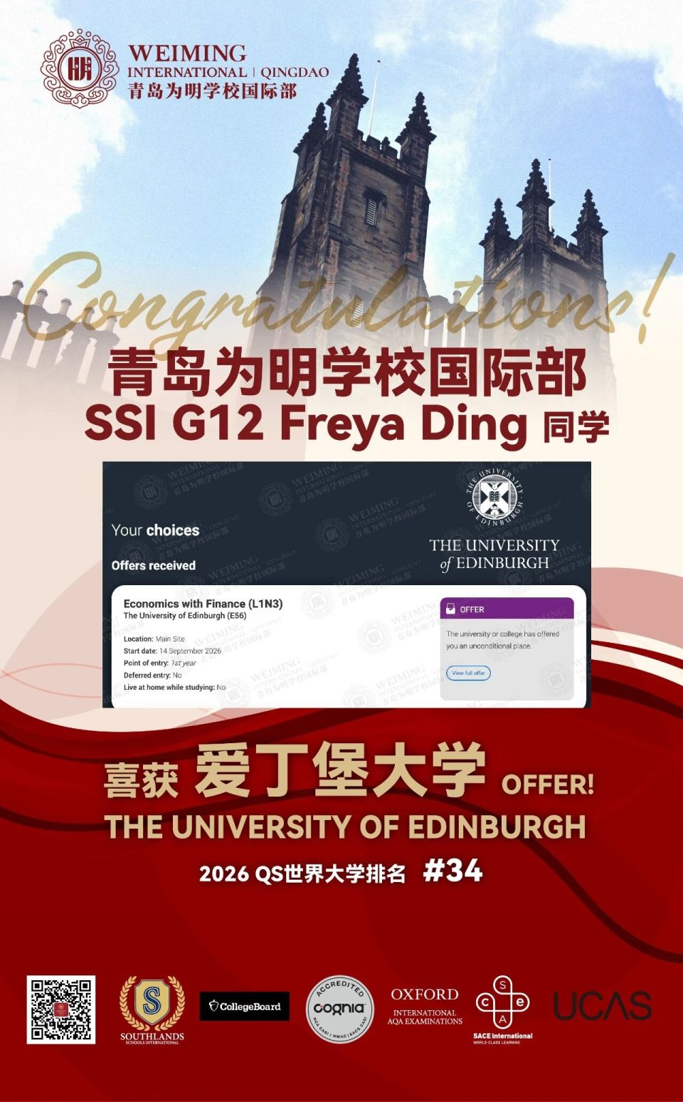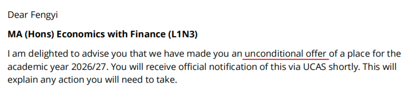 要理解AP申英本的核心优势,首先要分清英国大学的两种核心录取类型:有条件录取(Conditional Offer,简称Con.)与无条件录取(Unconditional Offer,简称Uncon.)。有条件录取是学校对学生的“初步认可”,要求学生在规定时间内满足后续条件(如A-Level实考成绩、雅思分数等)才能转为正式录取;而无条件录取则是学校发放的正式录取通知,意味着申请人已完全满足所有入学要求,无需再通过任何额外考试或达标条件即可直接入学。更关键的是,只有拿到无条件录取通知书,才能获取CAS(录取确认函),顺利推进留学签证申请。本次我们的Freya同学就获得了爱丁堡大学的无条件录取!