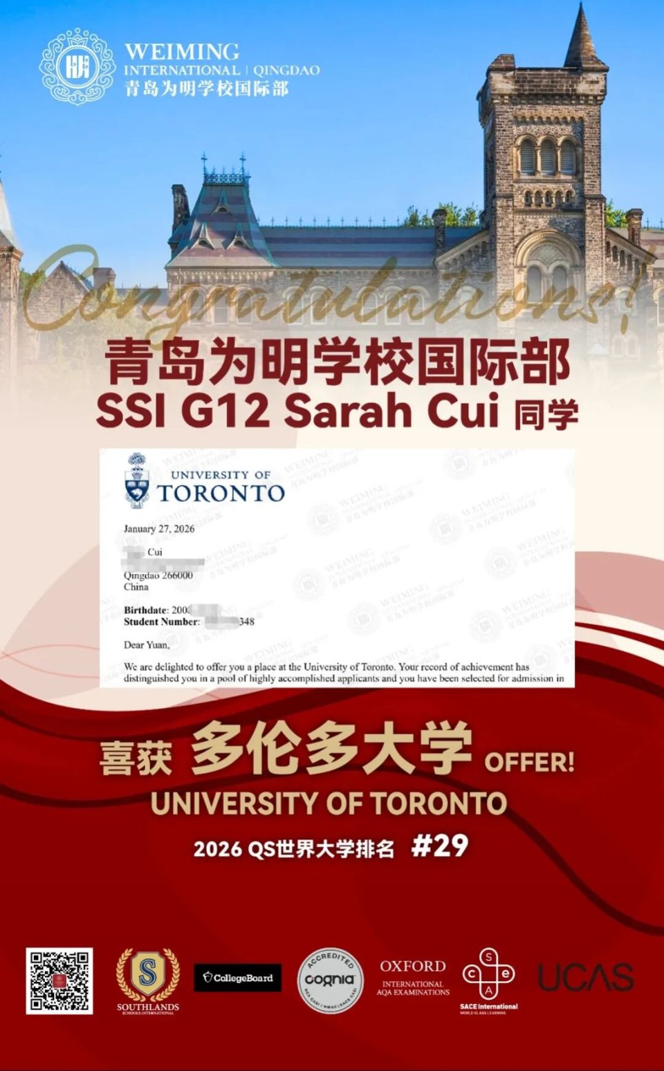 √ 多伦多大学录取 1封