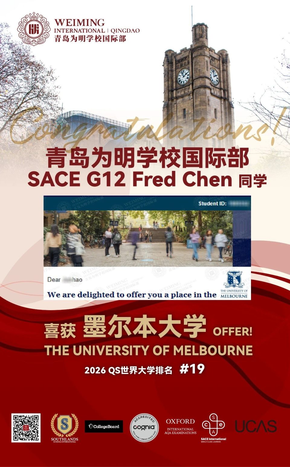 不断收获的好消息展现了为明学子的卓越实力与巨大潜力。无论是加拿大医博类顶尖名校、澳洲“八大”翘楚,还是美国顶尖的公立研究型大学,都为我们的同学敞开了大门。