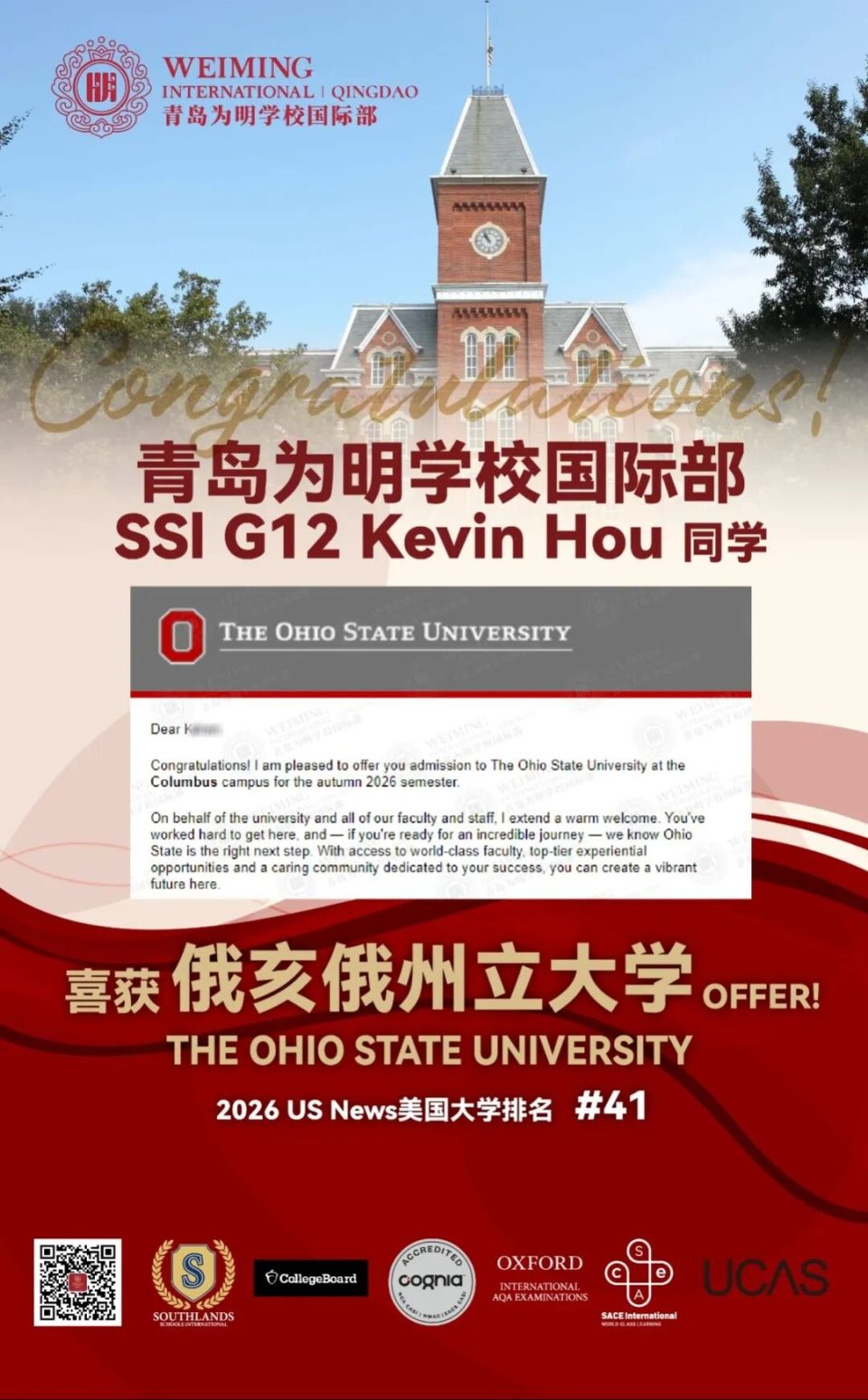 √ 俄亥俄州立大学录取 2封