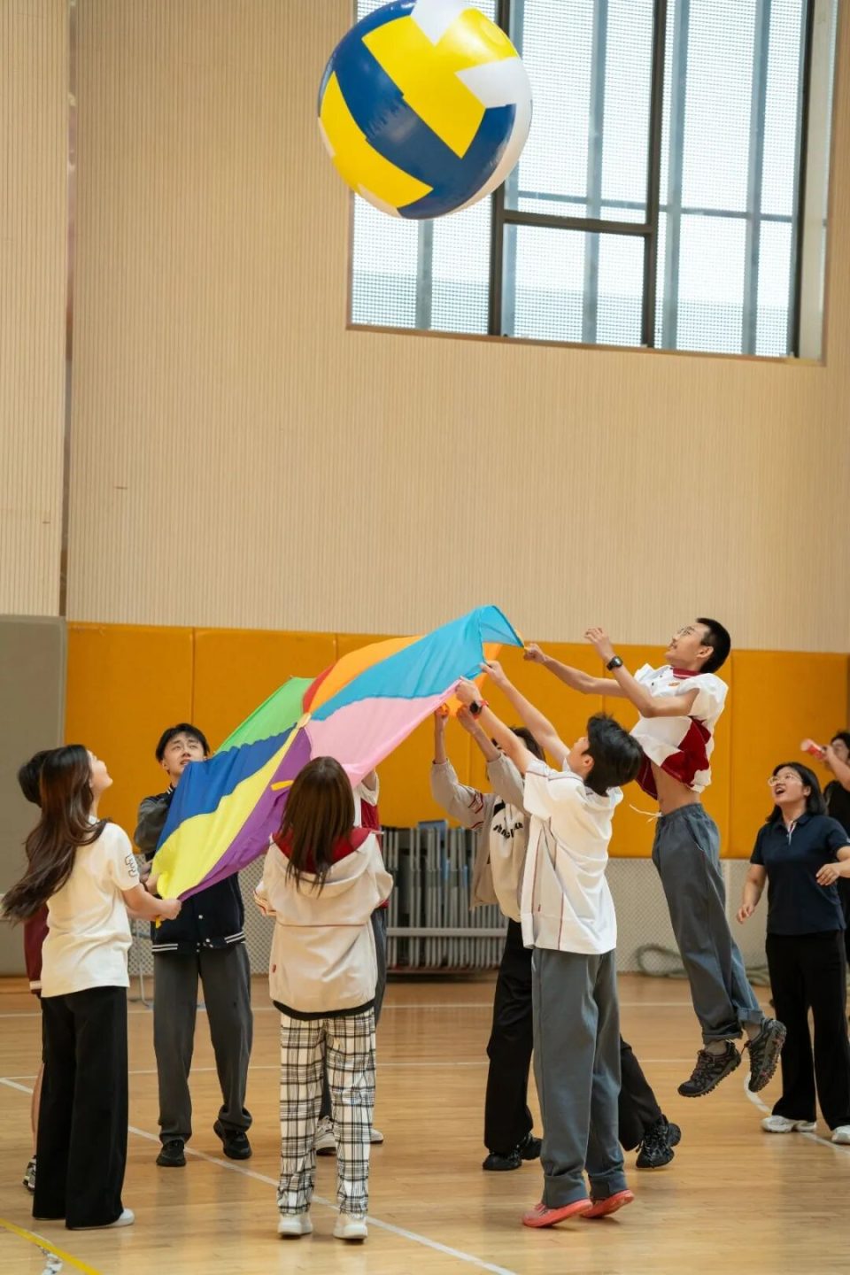 在拔河对抗赛中,一根绳子凝聚了整个班级的力量——为了集体荣誉,每个人都拼尽全力!而在“乾坤大挪移”环节,大家共同撑开伞布,默契配合、统一步伐,把超大号排球顺利送过球网。欢呼声中,我们看到了信任、合作和真正的团队精神。