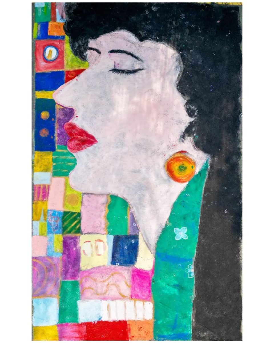 致敬奥地利国宝级画家克里姆特(Klimt),旨在传递永恒的美与爱,每个人内心深处都藏着一座金色宫殿,迷惘、挣扎、等待,都会在我们明白自己是谁之后,看到神殿发出的微光,温暖而坚定。画面中,色彩斑斓的背景与人物形成视觉张力,线条与色彩的自由流动突破传统写实边界,展现艺术对“美”的多元探索。克里姆特式的创作态度,正是G12的学生们追求“艺术自由与个性表达”的生动注脚。