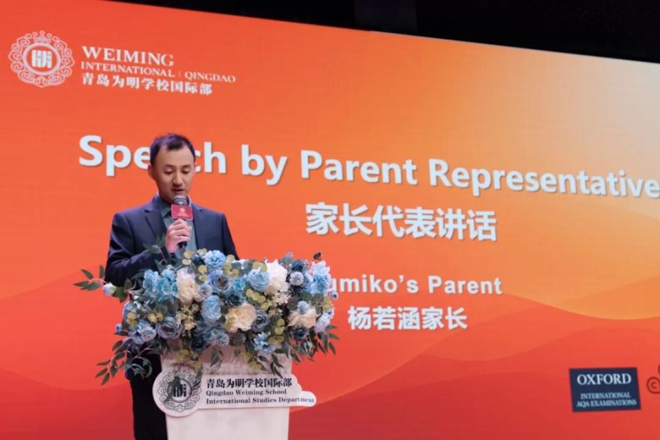 在此,我想代表家长们,向青岛为明学校国际部的每一位中外教老师道一声感谢。感谢你们用专业与爱心,守护孩子们的成长,点亮他们的前路;也感谢同学们,是你们的并肩同行,让这段青春岁月充满温暖与力量。衷心祝愿青岛为明学校桃李芬芳,再创辉煌!祝愿老师们工作顺利,幸福安康!也祝愿亲爱的同学们,带着在为明收获的知识与勇气,奔赴属于自己的星辰大海!”